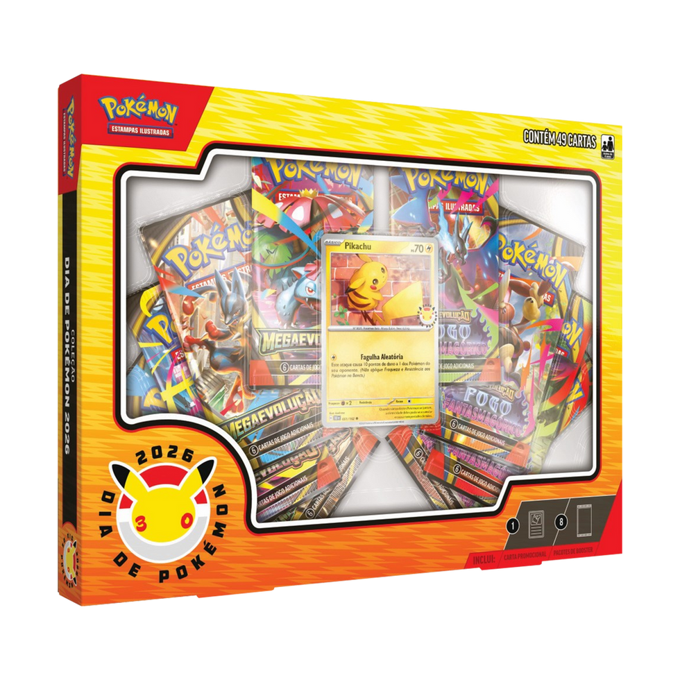 Comemore 30 anos de Pokémon! Todos os anos, no dia 27 de fevereiro, fãs de Pokémon ao redor do mundo celebram o Dia de Pokémon para comemorar o lançamento dos primeiríssimos jogos de videogame de Pokémon no Japão. O dia de Pokémon 2026 é uma ocasião ainda mais especial, já que é o 30º aniversário da Pokémon, e estão todos convidados para a festa! Comemore com uma carta promocional laminada de Pikachu com selo especial, além de oito pacotes de booster de diferentes expansões do Pokémon Estampas Ilustradas.