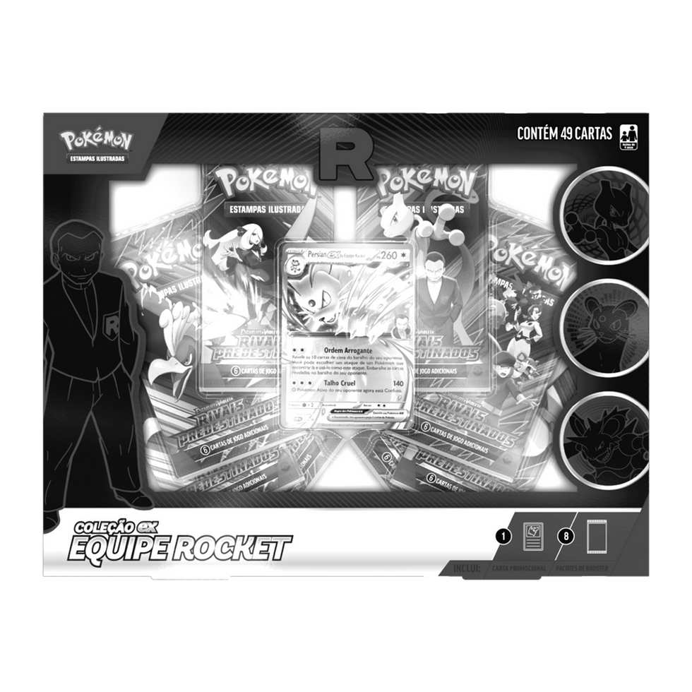 Escolha entre a mente estratégica de Mewtwo ex da Equipe Rocket, as toxinas potentes de Nidoking ex da Equipe Rocket ou o poder soberbo de Persian ex da Equipe Rocket, que aparecem nesta coleção como uma carta holográfica promocional, e descubra ainda mais cartas de Pokémon e de Treinador nos vários pacotes de booster.